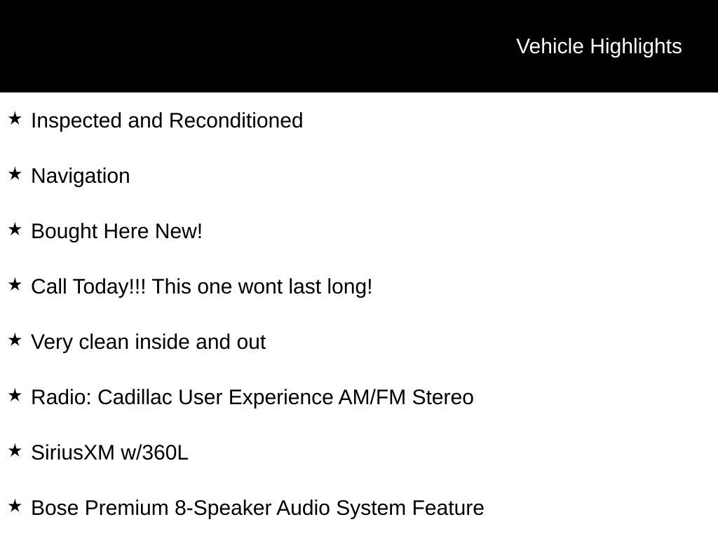 - Cadillac user experience, AM/FM stereo with 8" diagonal color information display, 4 USBs, 2 auxiliary power outlets, personalized profiles for each driver's settings, Natural Voice Recognition, Phone Integration for Wireless Apple CarPlay/Wireless Android Auto capability for compatible phone, Near Field Communication (NFC) mobile device pairing, Connected Apps and Teen Driver (Upgradeable to (IOT) Cadillac user experience with embedded navigation.)